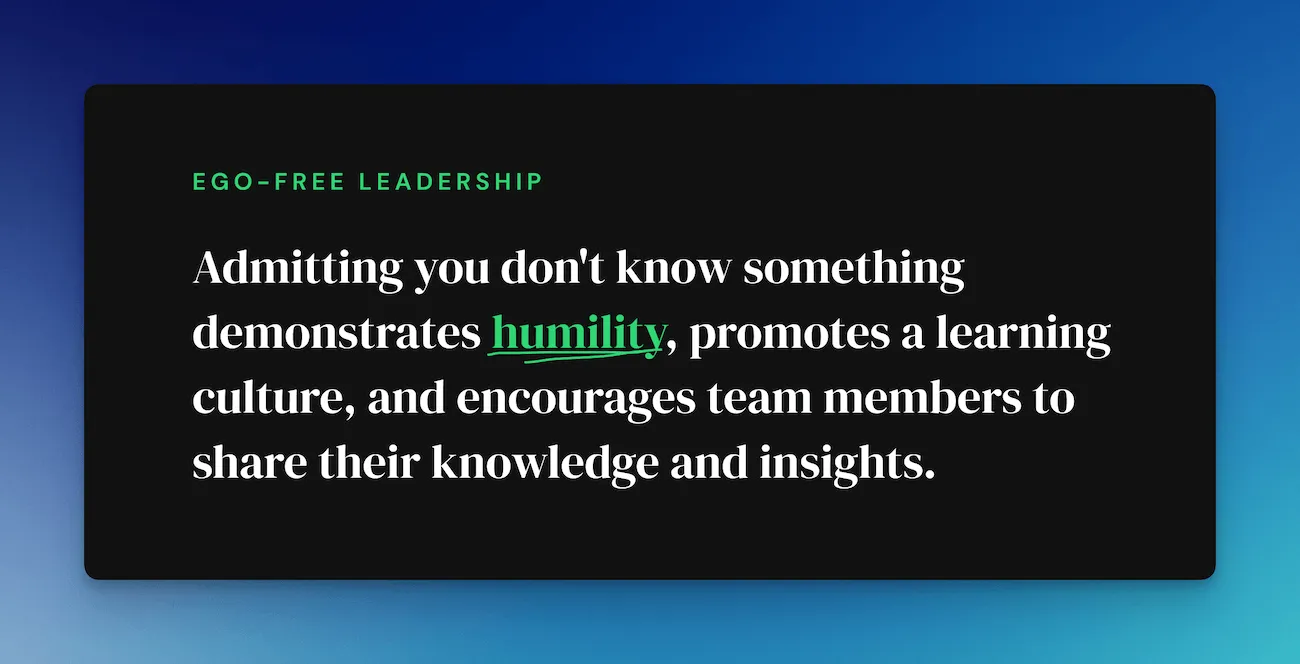 The vulnerability to say “I don’t know”. As a leader, there will be instances where you won’t have all the answers. It’s important to communicate this honestly instead of pretending to know everything. Admitting you don’t know something demonstrates humility, promotes a learning culture, and encourages team members to share their knowledge and insights. It shows you value the expertise of your team and are open to learning from them.